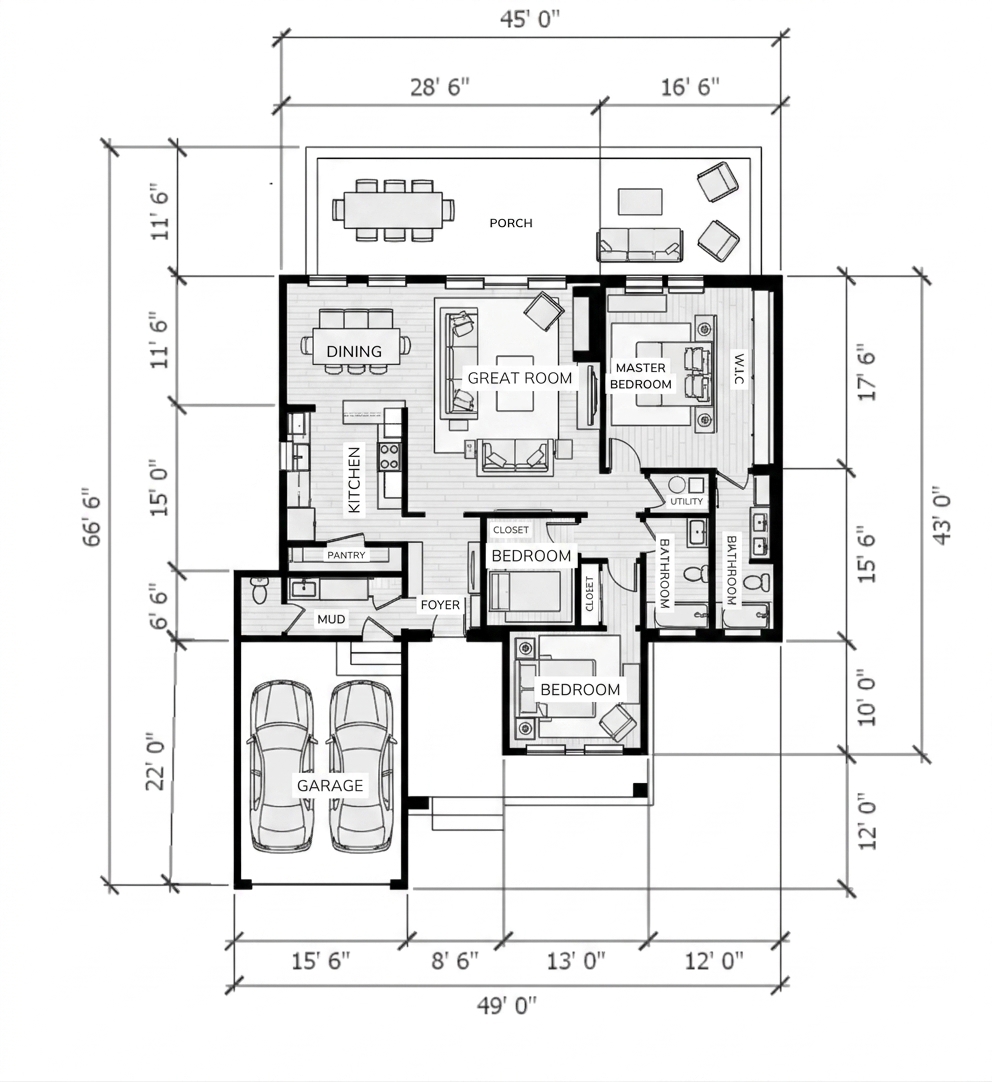 | 49′ 0″ WIDTH | 66′ 6″ DEPTH | Slab Foundation |