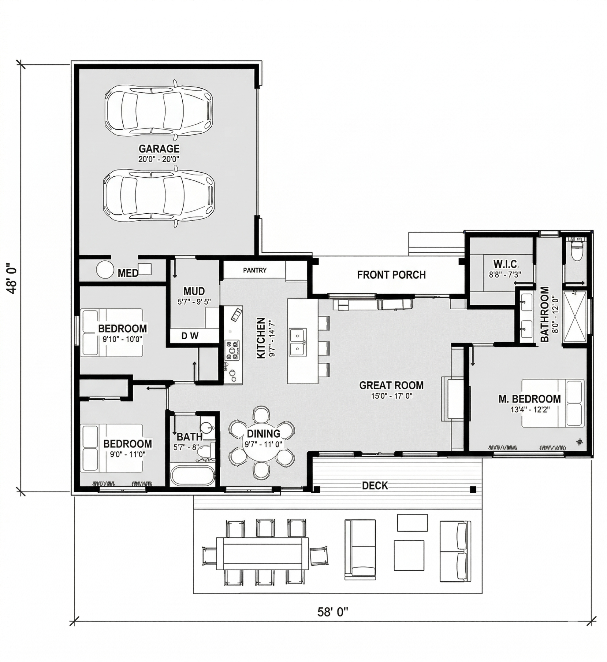 | CELLING HEIGHT 8′ | 58′ 6″ WIDTH | 48′ 0″ DEPTH | EX-WALL: 2×6 IN-WALL: 2X4 |