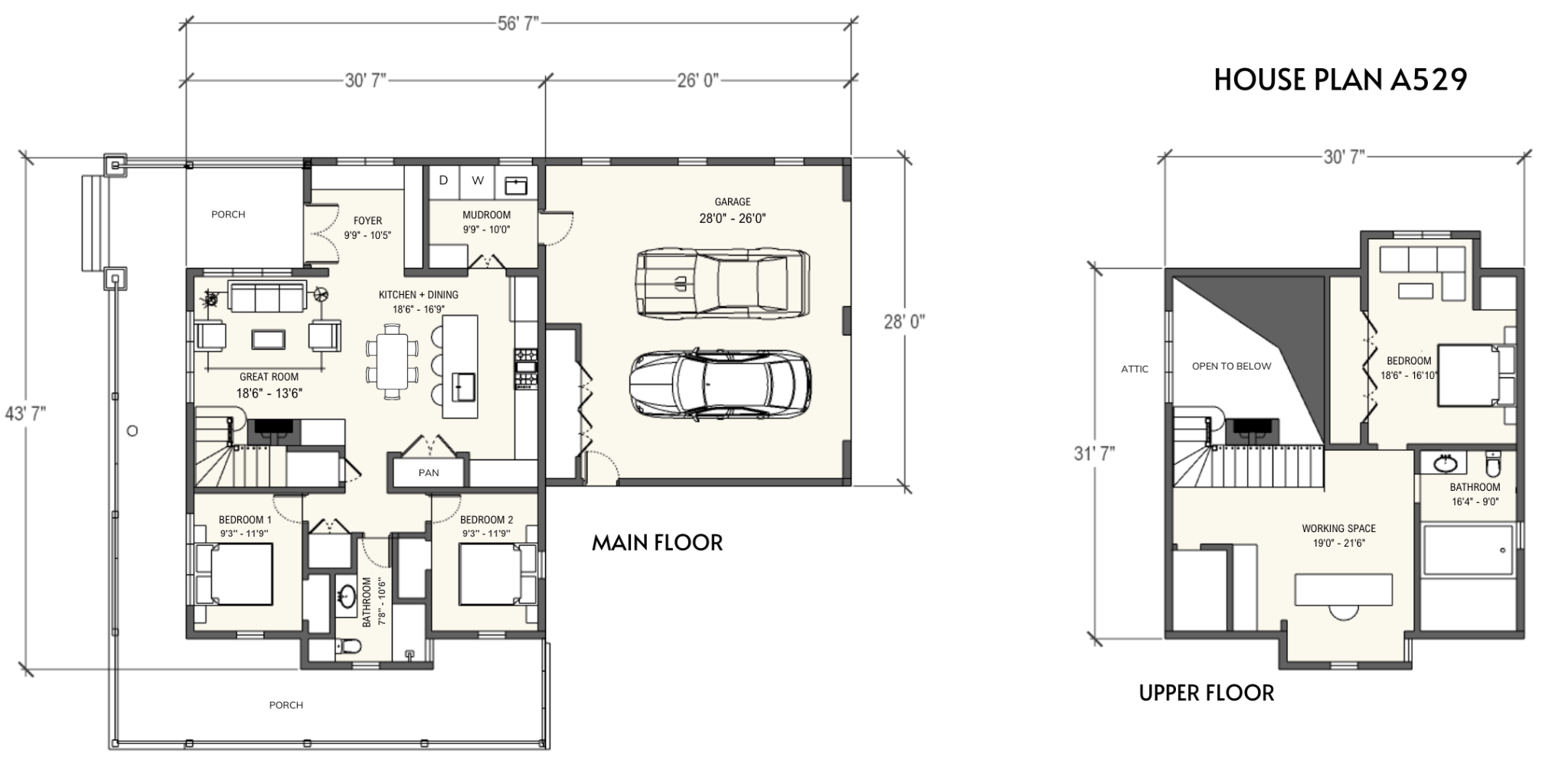 | CELLING HEIGHT 8′ | 43′ 7″ WIDTH | 30′ 7″ DEPTH | WALL: 2X8, 2X6 |