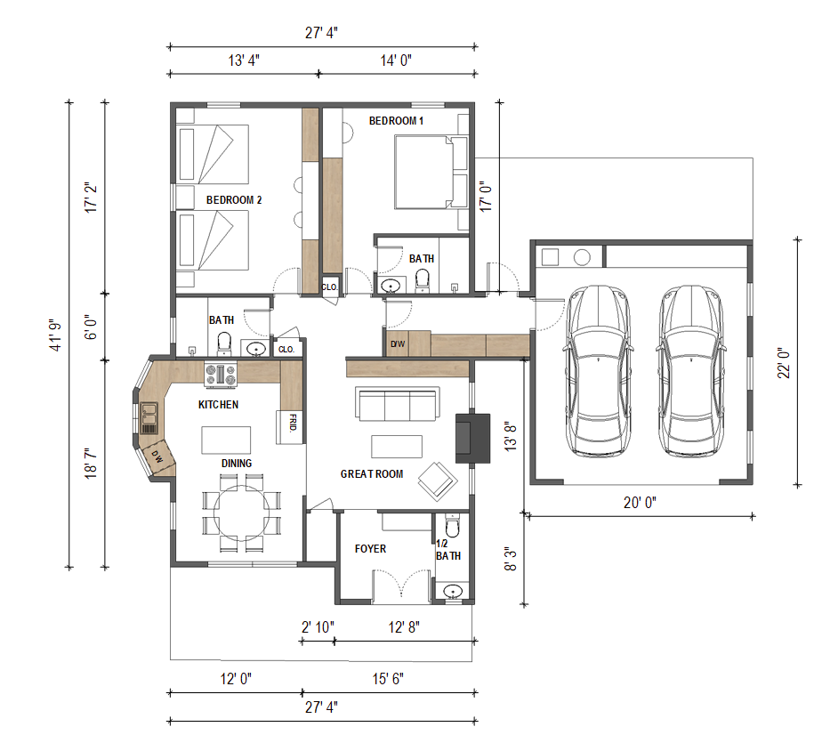 | 1 FLOOR | 27′ 4″ WIDTH | 41′ 9″ DEPTH | SLAB ON GRADE |