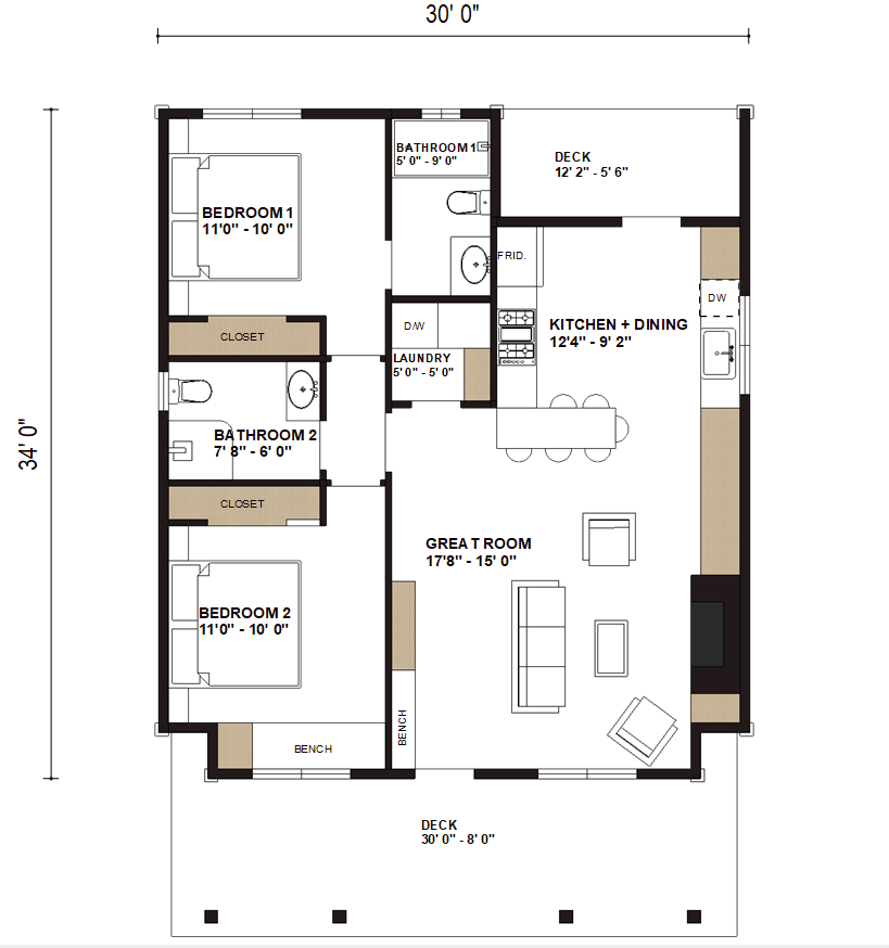 | 2×6 Wall | 30′ 0″ WIDTH | 34′ 0″ DEPTH | Crawl space |
