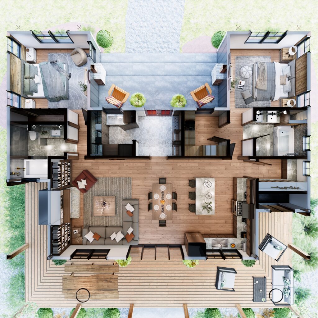 - Exterior Elevations: Front, rear, and side views that clearly illustrate the exterior design, materials, and proportions.