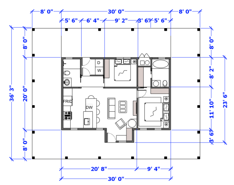 | CELLING HEIGHT 8′ | 30′ 0″ WIDTH | 23′ 6″ DEPTH | EX-WALL: 2X6 IN-WALL: 2X4 |