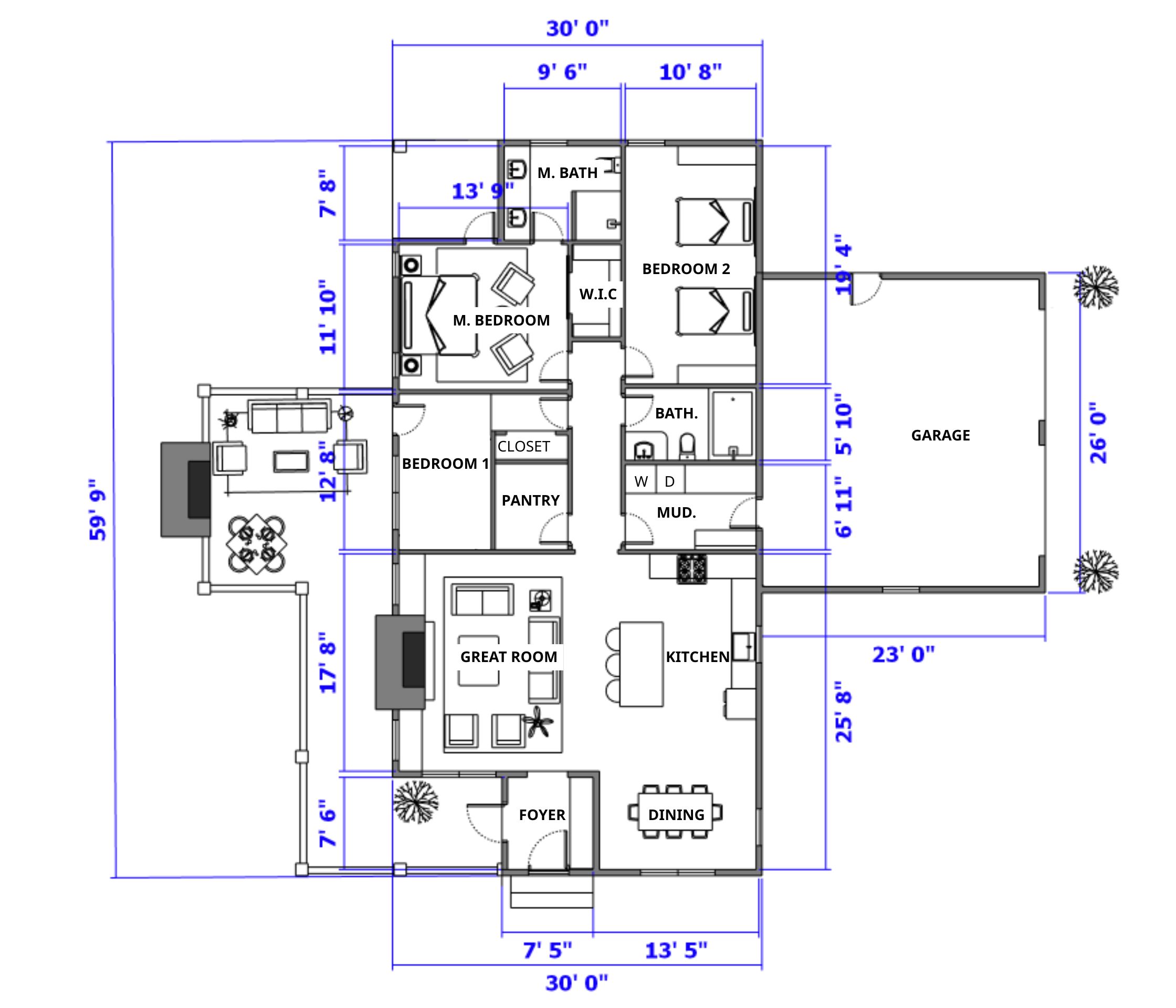 | 1 FLOOR | 30′ 0″ WIDTH | 59′ ” DEPTH | 2×6 -Exterior Wall 2×4 – Interior Wall |