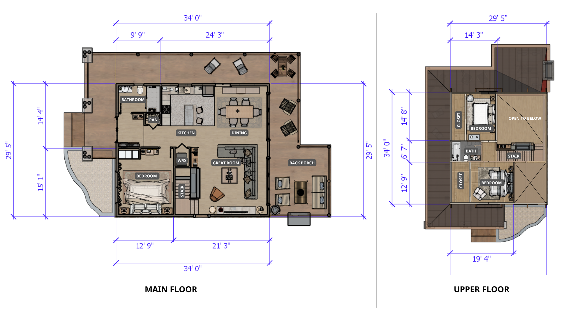 | CELLING HEIGHT 9′ | 29′ 5″ WIDTH | 24′ 0″ DEPTH | EX-WALL: 2X6 IN-WALL: 2X4 |