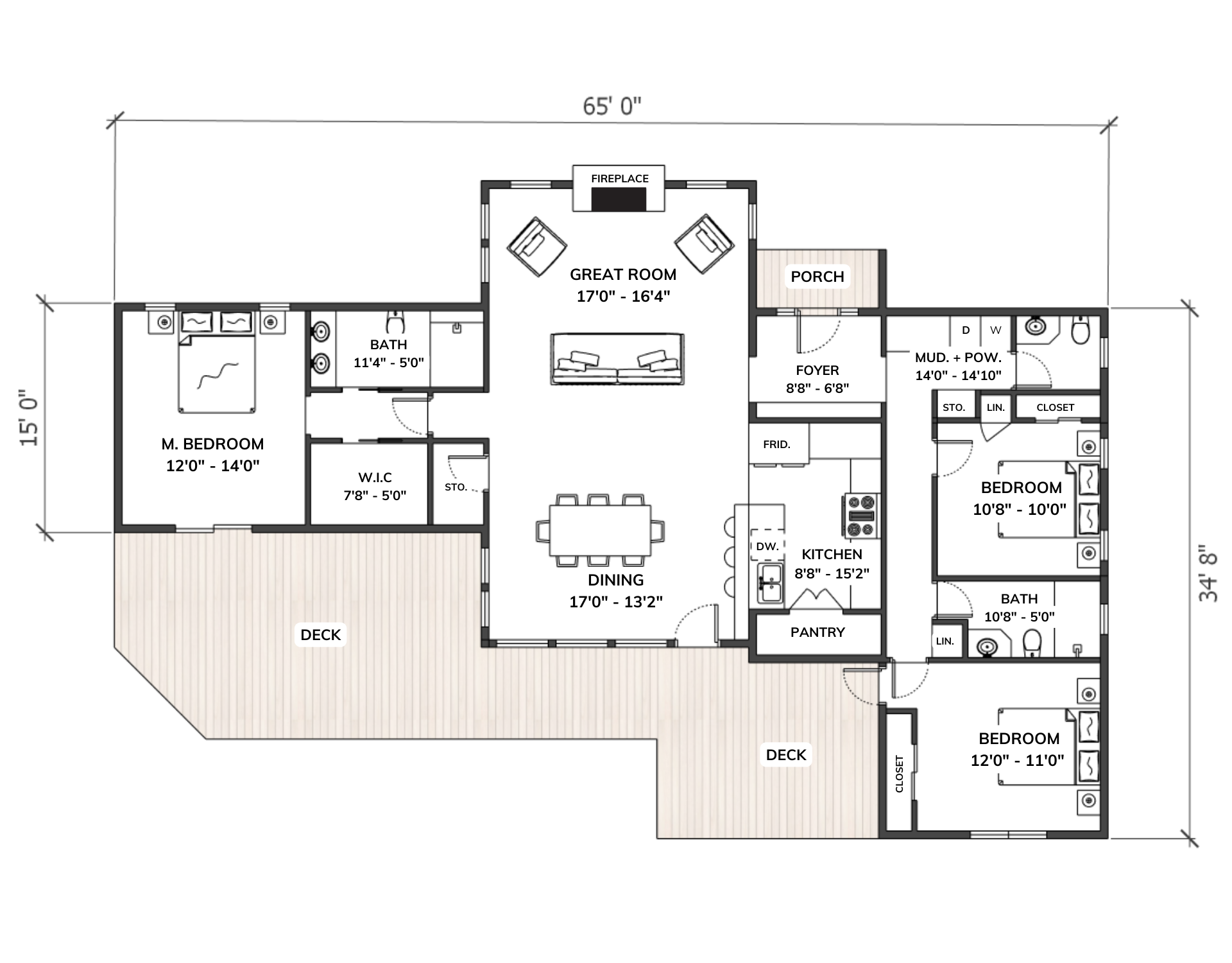 | Crawl Space Foundation | 65′ 0″ WIDTH | 34′ 8″ DEPTH | 2×6 -Exterior Wall 2×4 – Interior Wall |