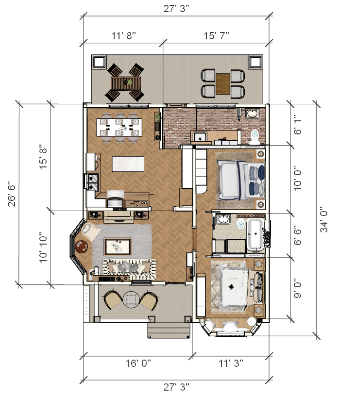 | CELLING HEIGHT 9′ | 27′ 3″ WIDTH | 34′ 0″ DEPTH | WALL: 2X6 |