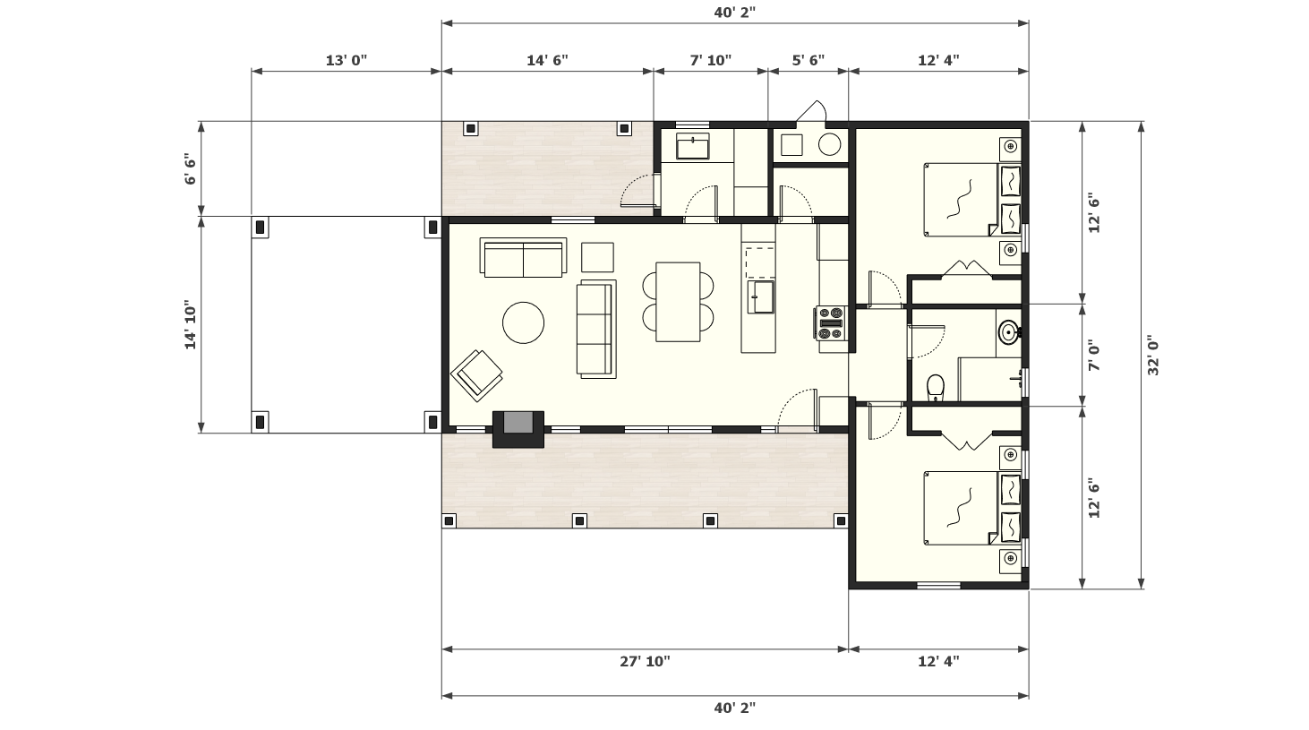 | CELLING HEIGHT 8′ | 40′ 4″ WIDTH | 32′ 0″ DEPTH | WALL: 2X6 |