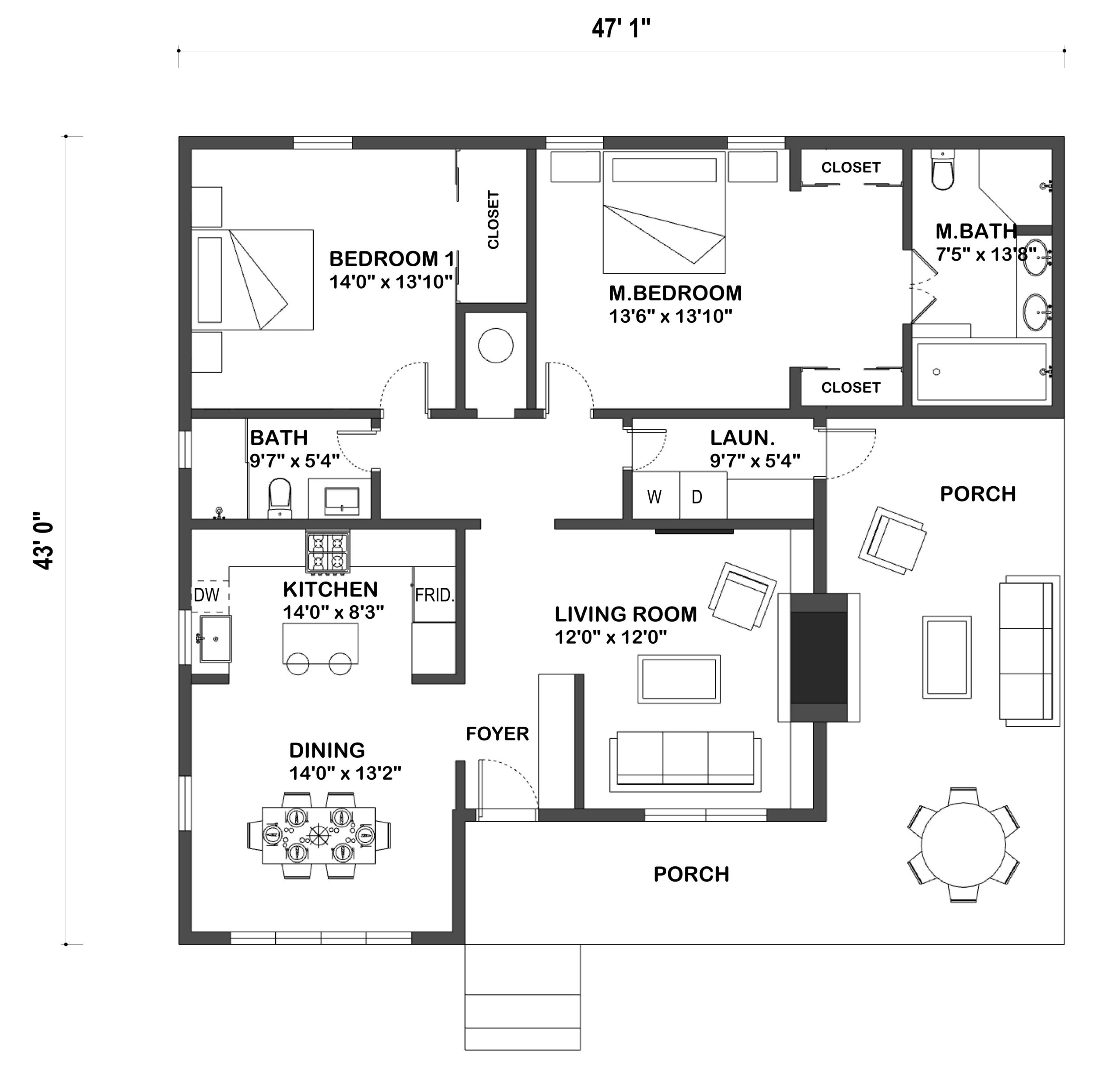 | 1 FLOOR | 47′ 0″ WIDTH | 43′ 0″ DEPTH | 0 GARAGE |