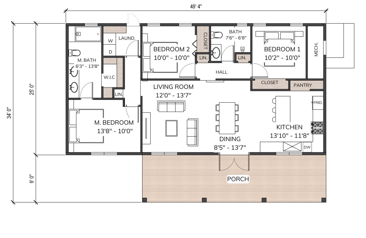 | 1 FLOOR | 49′ 4″ WIDTH | 25′ 0″ DEPTH | CELLING HEIGHT: 9′ |